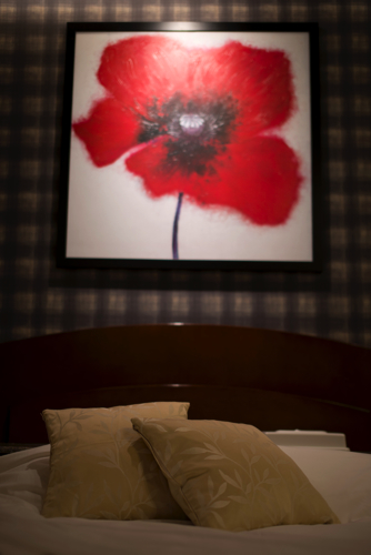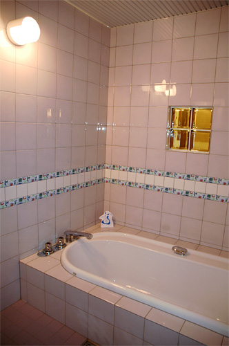 石壁やカフェ風ラウンドテーブル、街灯のような丸い電灯がヨーロッパの雰囲気を演出しています。