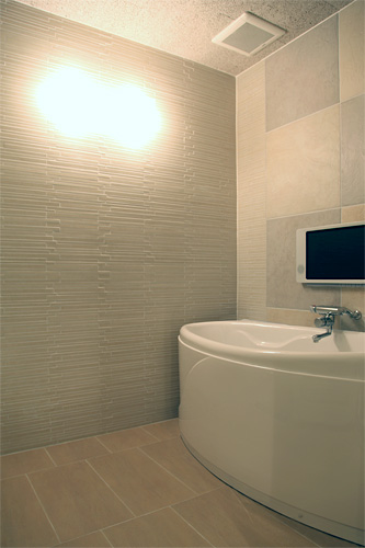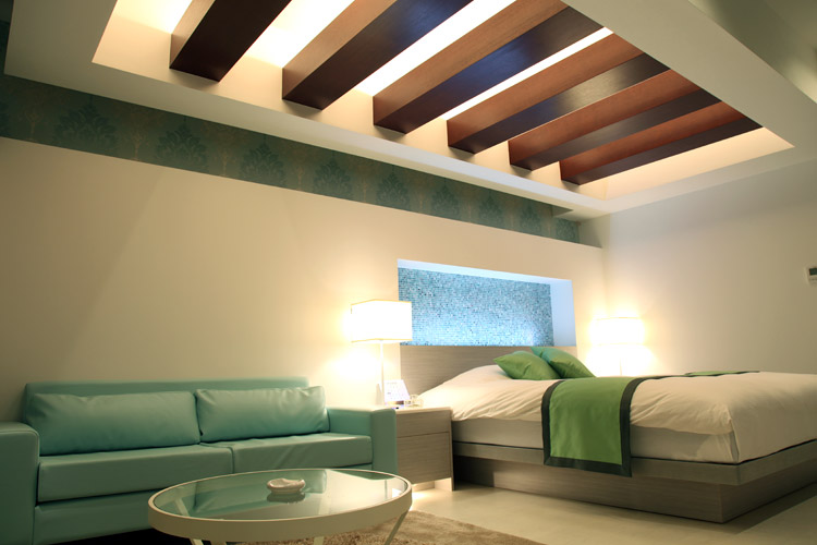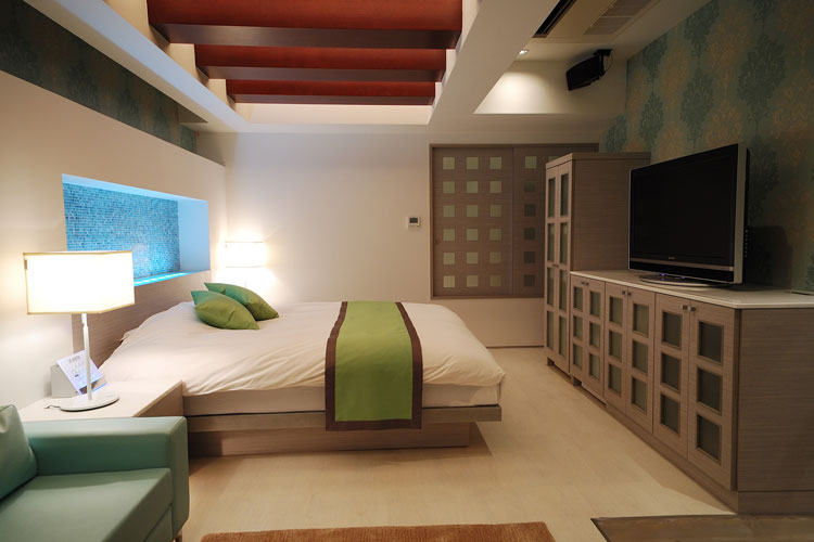 天井に走る太い梁、ヘッドボードのモザイクタイルが印象的で、力強さと繊細さを併せ持った、安心感のある空間です。