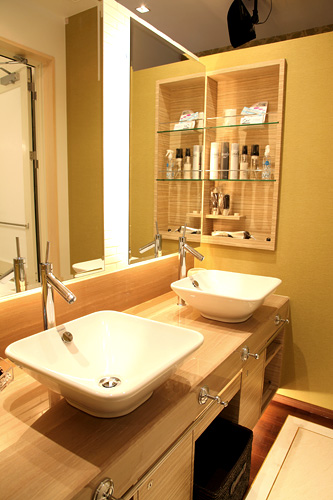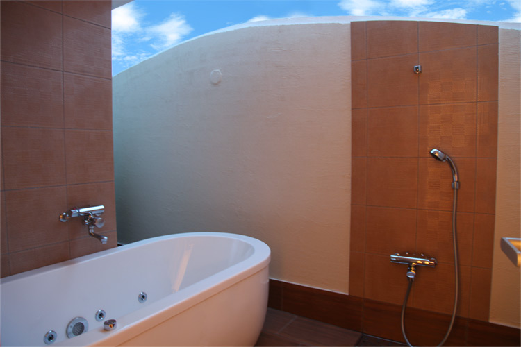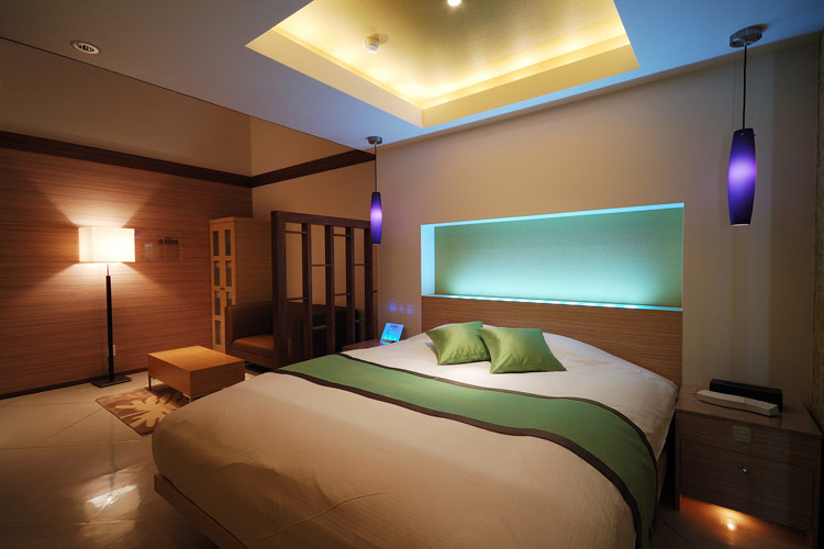 シンプル&モダンなアジアンスタイルをベースに、表情の異なる間接照明を組み合わせ、安らぐリラックス空間に。露天風呂では、夜空を見上げながら癒しのバスタイムを…。