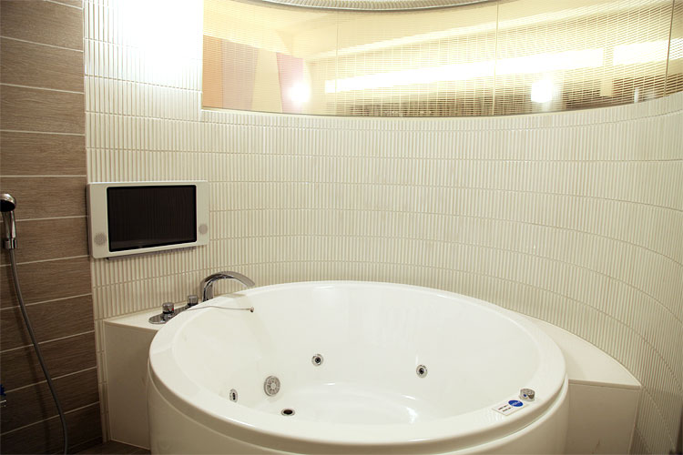 真っ白なタイルに、パステルカラーのポップなインテリア、円形のバスルームなど、明るくキュートに。